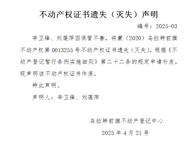 辛卫锋 刘莲萍不动产权证书遗失(灭失)声明