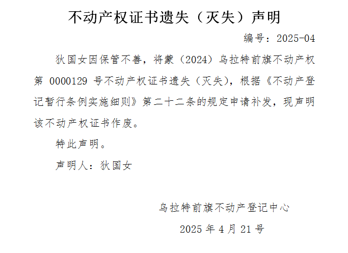 狄国女不动产权证书遗失(灭失)声明