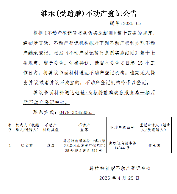 刘桂花继承(受遗赠)不动产登记公告
