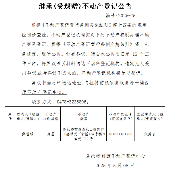 张秀珍继承(受遗赠)不动产登记公告