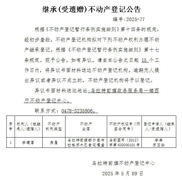 来源:乌拉特前旗不动产登记中心