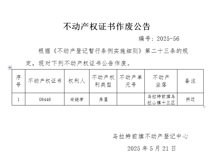 尚继学不动产权证书作废公告