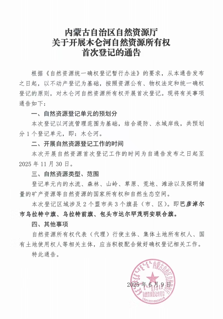内蒙古自治区自然资源厅关于开展木仑河自然资源所有权首次登记的通告