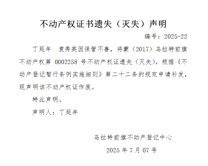 丁延年 袁秀英不动产权证书遗失(灭失)声明