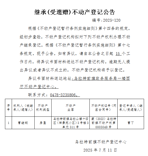胡建忠 刘春娥继承(受遗赠)不动产登记公告
