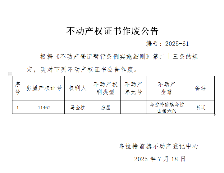 马金柱不动产权证书作废公告