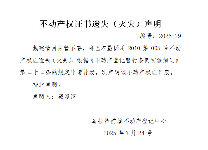 藏建清不动产权证书遗失(灭失)声明