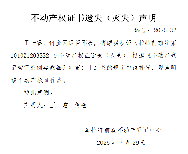 王一睿 何金不动产权证书遗失(灭失)声明
