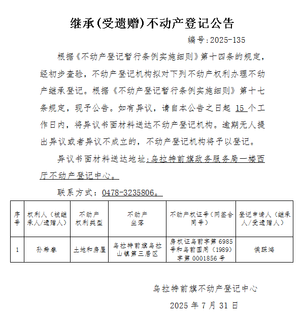 侯踩鸿继承(受遗赠)不动产登记公告