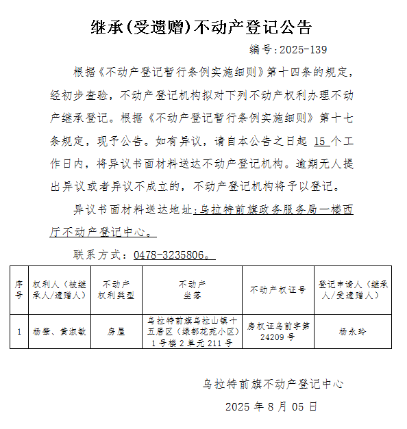 杨永玲继承(受遗赠)不动产登记公告