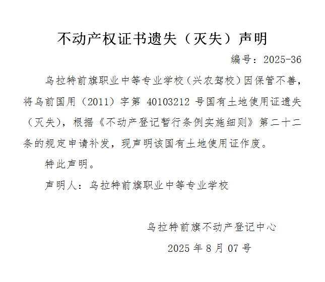 乌拉特前旗职业中等专业学校(兴农驾校)不动产权证书遗失(灭失)声明