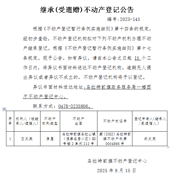 武文茂继承(受遗赠)不动产登记公告