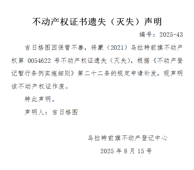 吉日格图不动产权证书遗失(灭失)声明