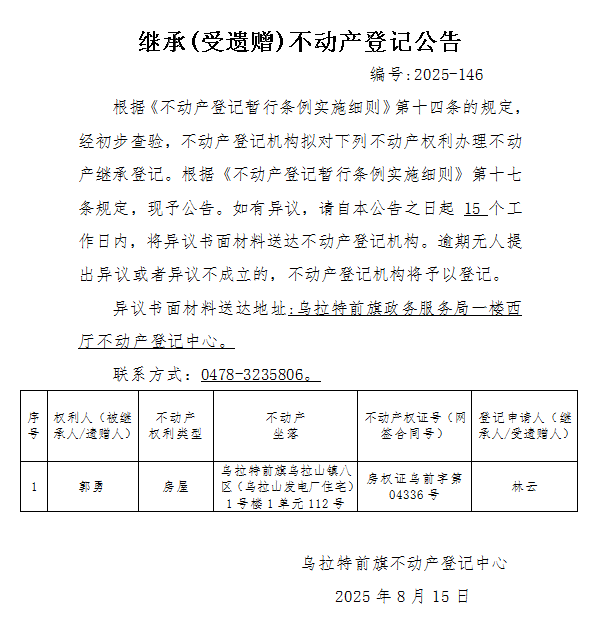 来源:乌拉特前旗不动产登记中心