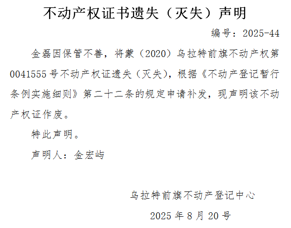 金磊不动产权证书遗失(灭失)声明