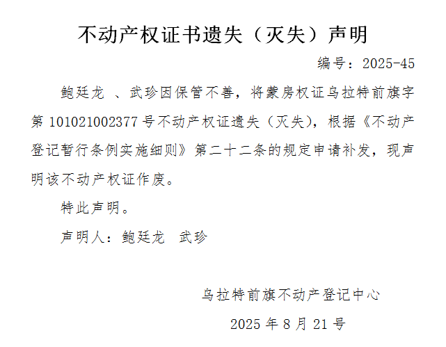 鲍廷龙 武珍不动产权证书遗失(灭失)声明