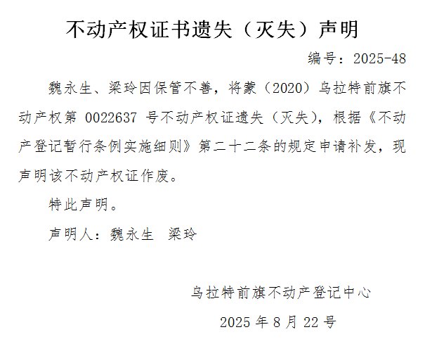 魏永生 梁玲不动产权证书遗失(灭失)声明