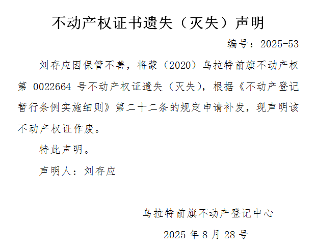 刘存应不动产权证书遗失(灭失)声明