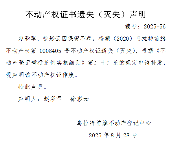 赵彩军 徐彩云不动产权证书遗失(灭失)声明