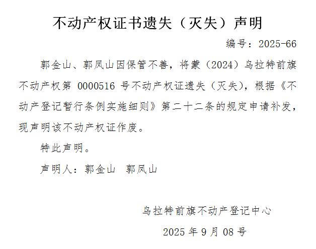 郭金山 郭凤山不动产权证书遗失(灭失)声明
