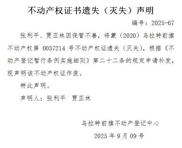 张利平 贾亚林不动产权证书遗失(灭失)声明