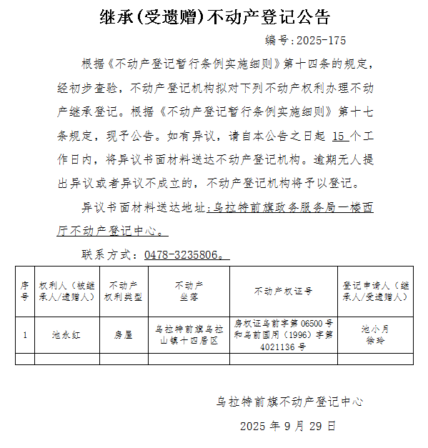 池小月 徐玲继承(受遗赠)不动产登记公告