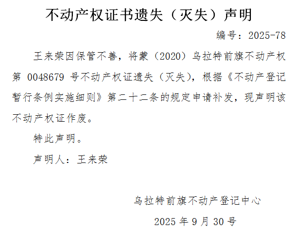 于洋 朱培英不动产权证书遗失(灭失)声明