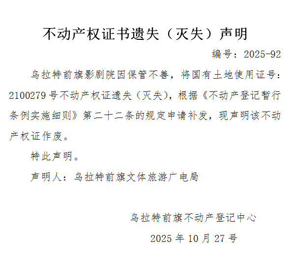 乌拉特前旗文体旅游广电局不动产权证书遗失(灭失)声明