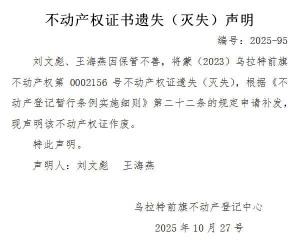 刘文彪 王海燕不动产权证书遗失(灭失)声明