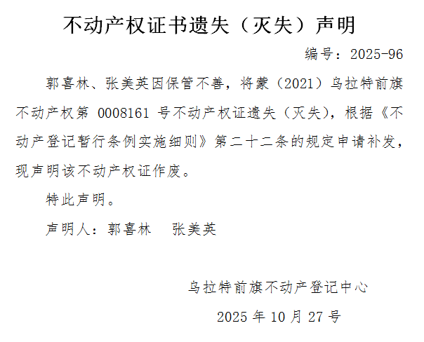 郭喜林 张美英不动产权证书遗失(灭失)声明