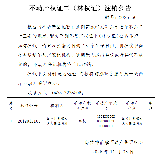 乌拉特前旗大佘太镇红明村不动产权证书(林权证)注销公告