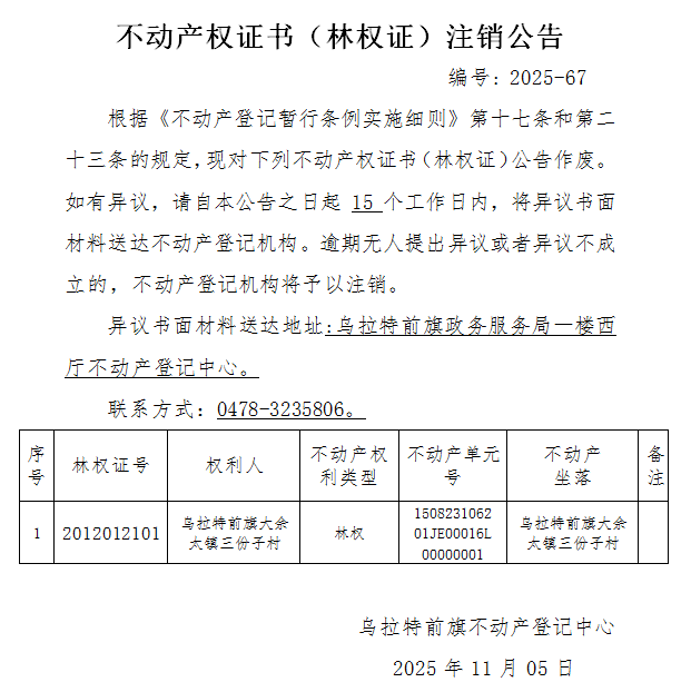 乌拉特前旗大佘太镇红明村不动产权证书(林权证)注销公告