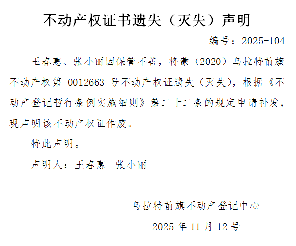 王春惠 张小丽不动产权证书遗失(灭失)声明