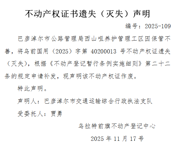 巴彦淖尔市公路管理局西山咀养护管理工区不动产权证书遗失(灭失)声明