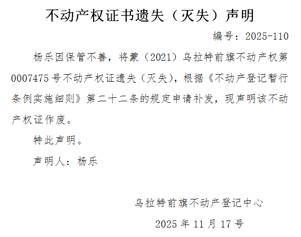 杨乐不动产权证书遗失(灭失)声明