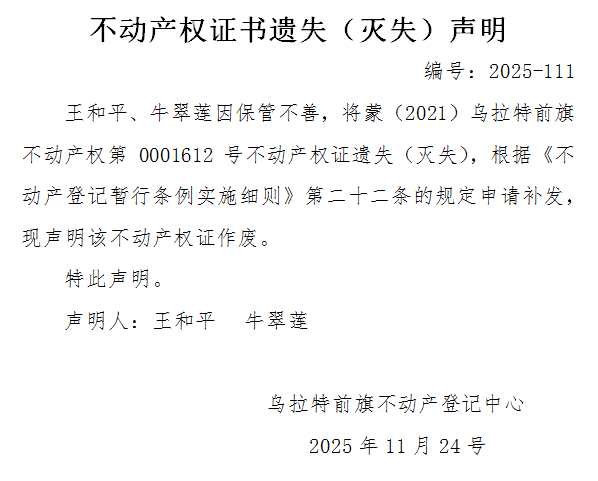王和平 牛翠莲不动产权证书遗失(灭失)声明
