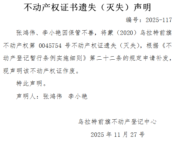 张鸿伟 李小艳不动产权证书遗失(灭失)声明
