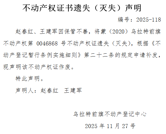 赵春红、王建军不动产权证书遗失(灭失)声明