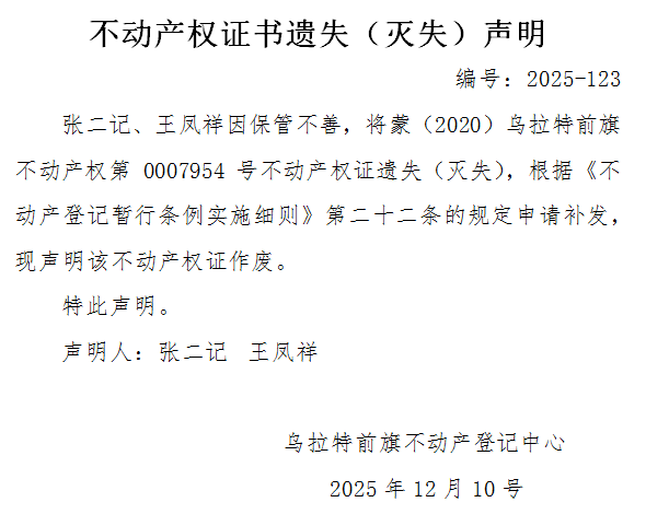 张二记、王凤祥不动产权证书遗失(灭失)声明