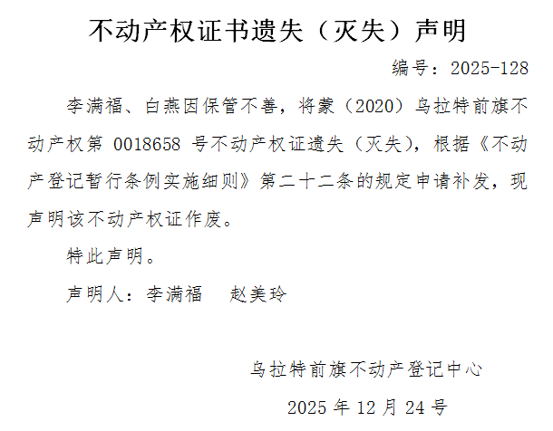 李满福、白燕不动产权证书遗失(灭失)声明