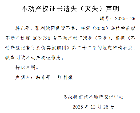 韩东平、张利娥不动产权证书遗失(灭失)声明