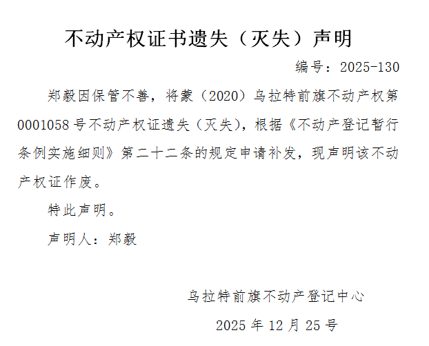 郑毅不动产权证书遗失(灭失)声明