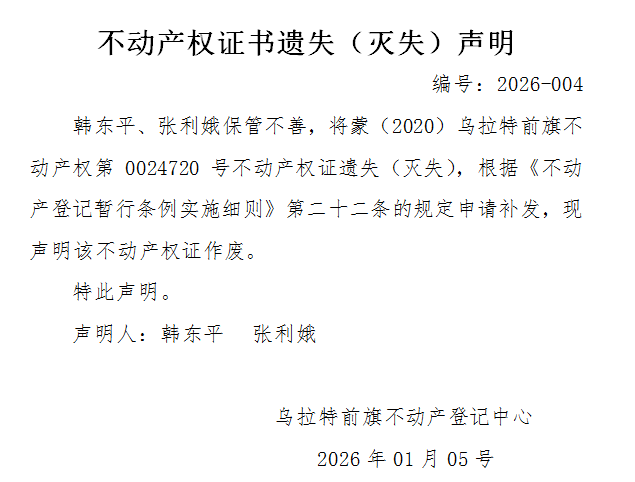 韩东平、张利娥不动产权证书遗失(灭失)声明