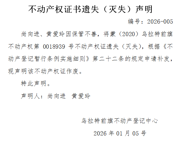 尚向进、黄爱玲不动产权证书遗失(灭失)声明
