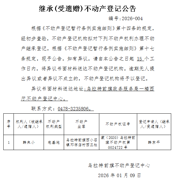 韩东平继承(受遗赠)不动产登记公告