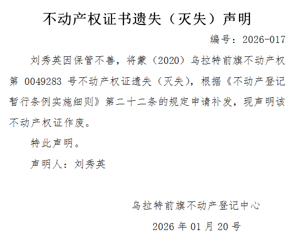 庞俊义 韩翠英不动产权证书遗失(灭失)声明