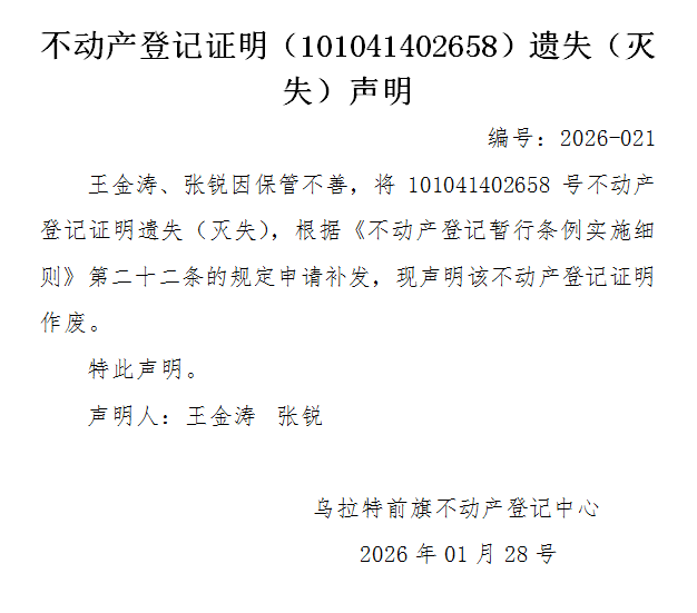 王金涛、张锐不动产登记证明(101041402658)遗失(灭失)声明