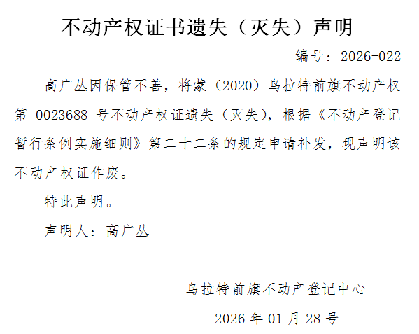 高广丛不动产权证书遗失(灭失)声明