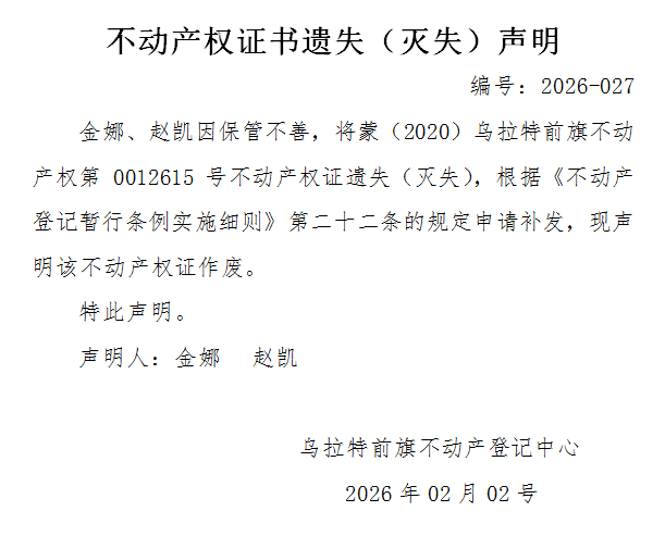 金娜、赵凯不动产权证书遗失(灭失)声明