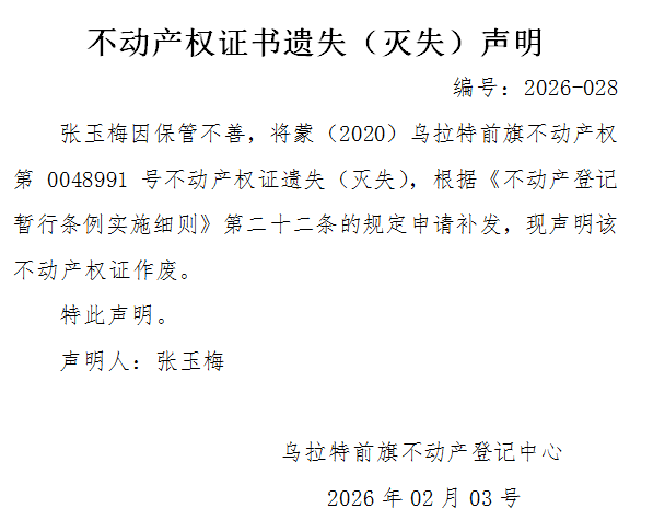 张玉梅不动产权证书遗失(灭失)声明